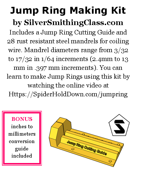 You will decide which coiling mandrel you need by finding the size you need on the Jump Ring Sizing chart. The chart will show you what both inside and outside dimensions based on the size and thickness of the wire used. You will be able to make jump rings for Silver, Gold, Copper and many other metals.
