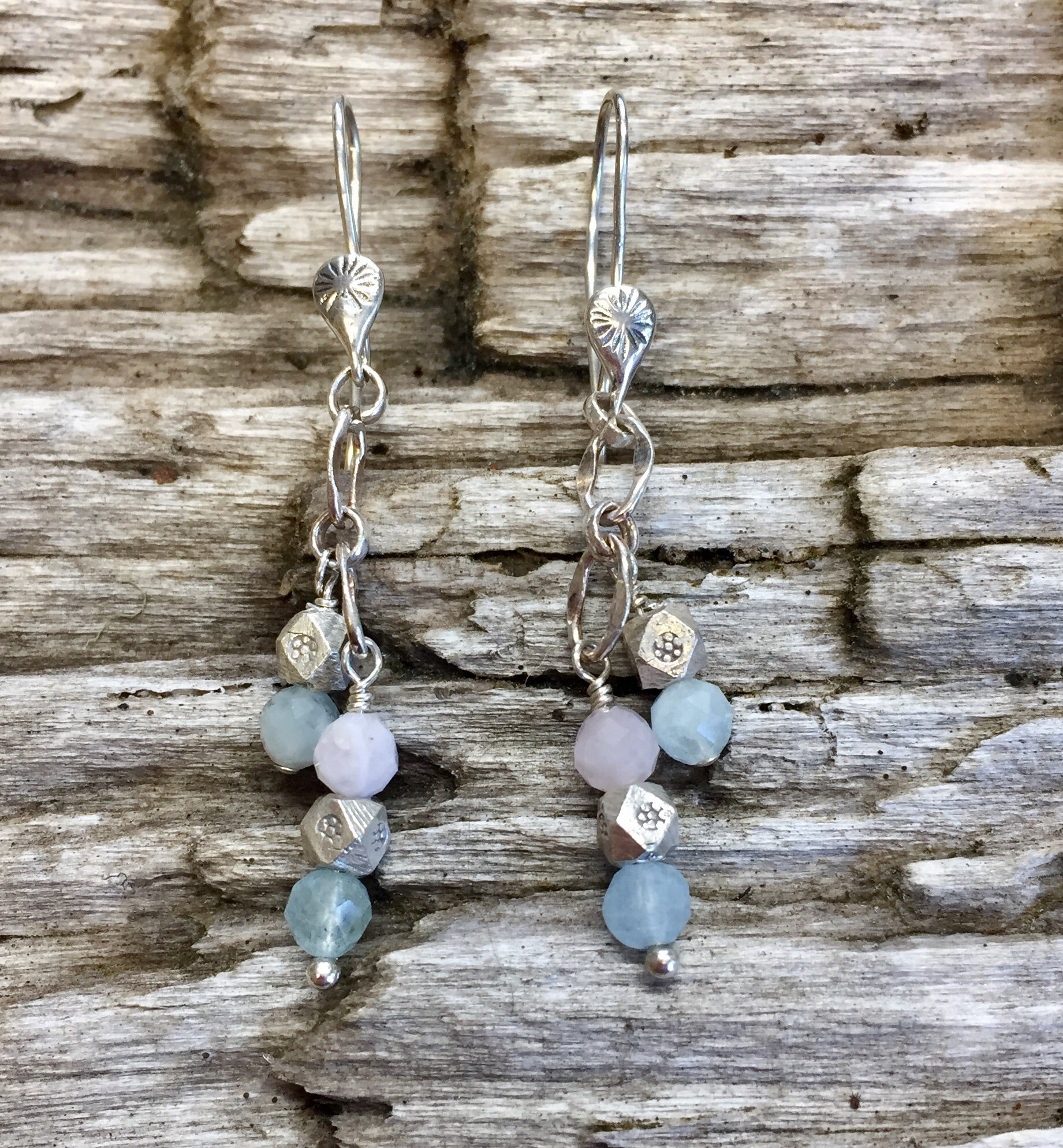 Bali silver, sterling silver chain and faceted aquamarine rounds create this beautiful 3 strand bracelet and earring set. All findings are sterling silver. Bracelet length is 7 inches